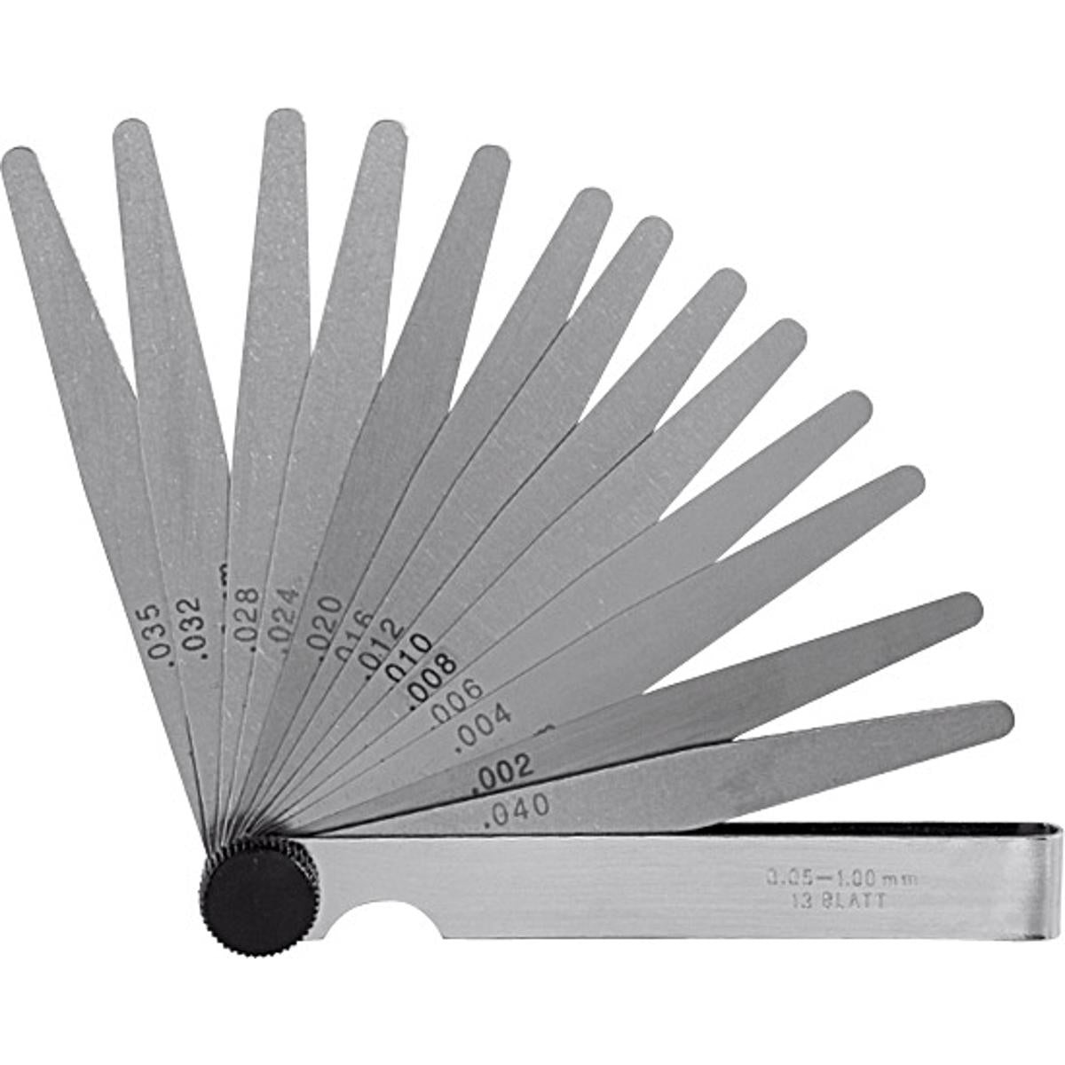 Hard spring steel blades, clearly labelled. Equal width steel blades, pivoted on a riveted joint to fold away. Tapered steel blades. In nickel-plated casing, with clamp. Steel feeler gauge, trowalised, accuracy T3. Feeler gauge.