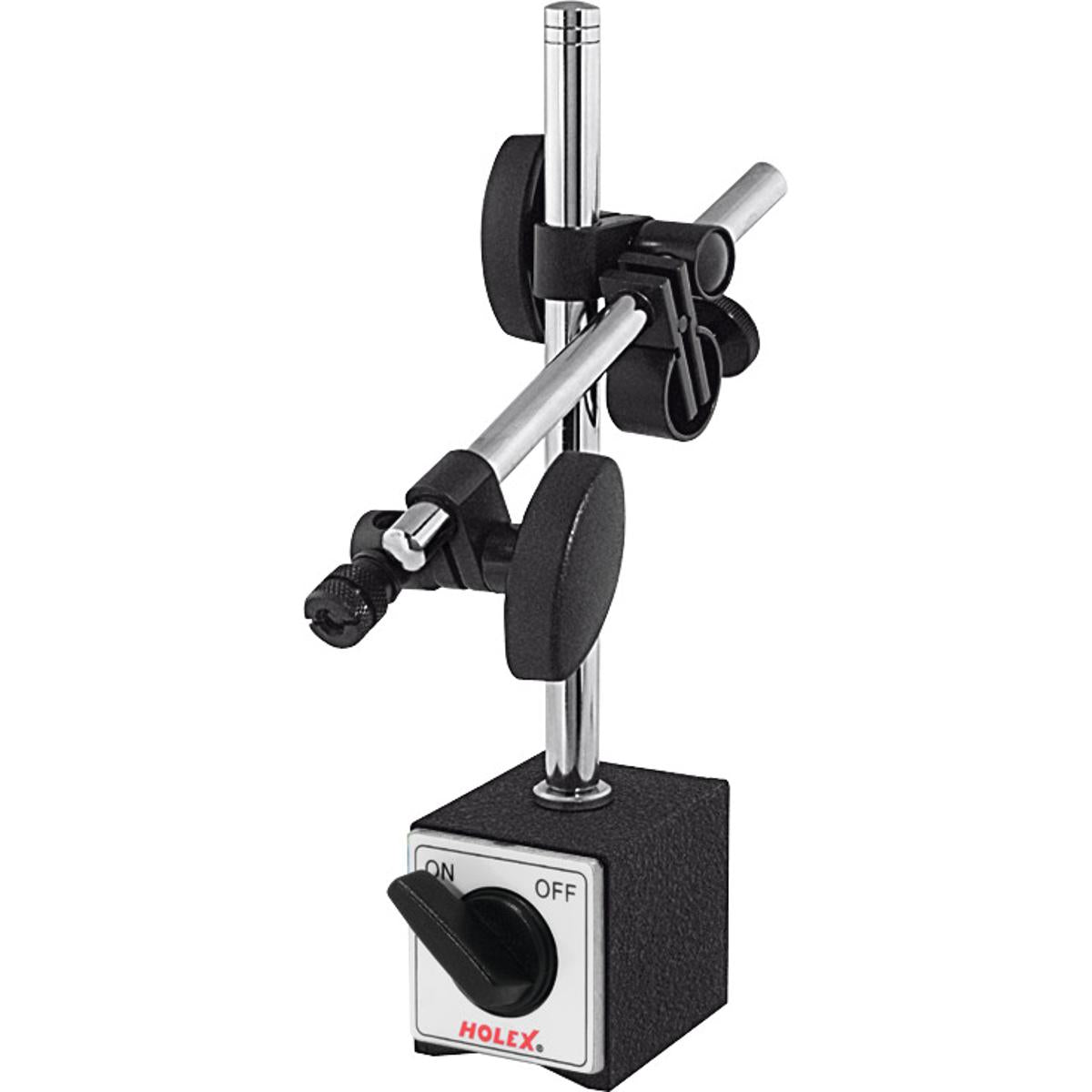 Magnetic measuring stand with fine adjustment. Stable column with longitudinally adjustable cross arm. Magnetic base with Vee sole and rotary switch. Dial indicator holder for clamping shanks ⌀ 6 mm and ⌀ 8 mm.