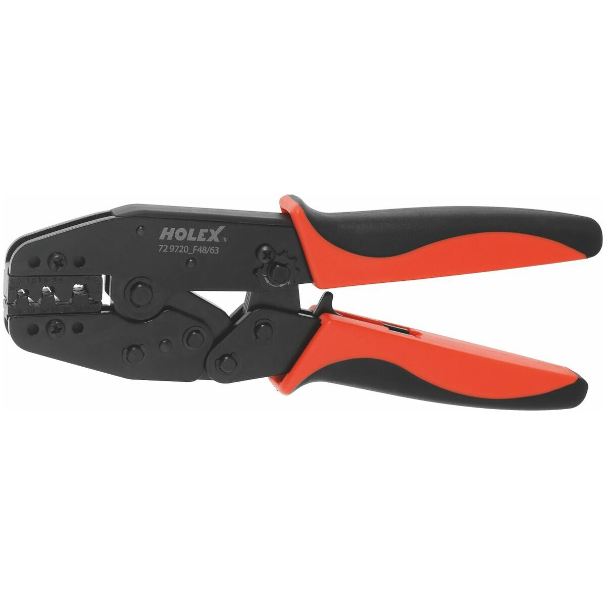 Steel body with compound action. Defined crimping force accurately ensured by integral stop function. Economy version. F48/63 including holder for blade terminals.