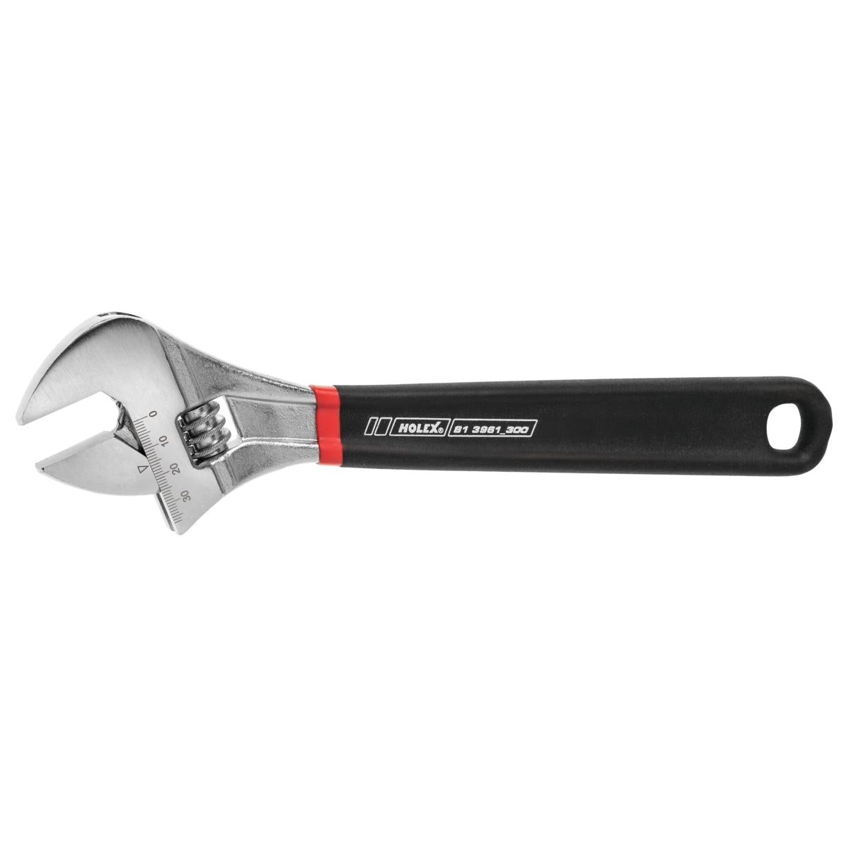 Slim design with double-T-profile shank (chromium plated). Jaw angle 22°. Drop-forged and hardened. With scale on the jaw. With non-slip grip. Adjustable spanner, chrome-plated.