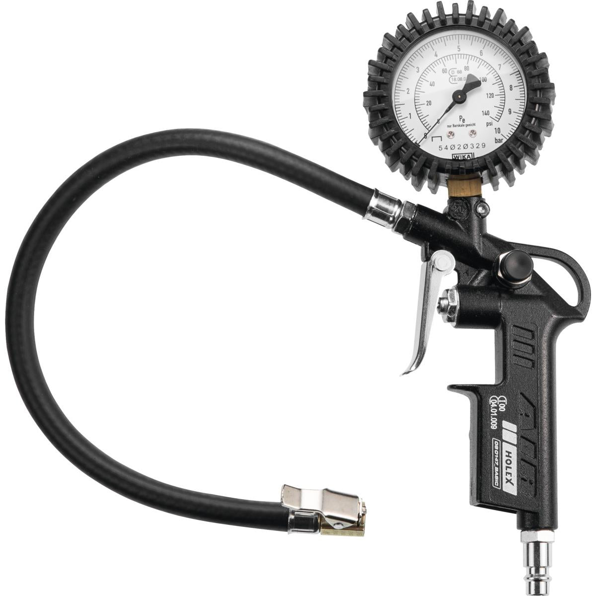 Đồng hồ đo áp suất và máy bơm lốp bằng tay chưa hiệu chỉnh với đồng hồ đo áp suất đường kính 63 mm, được bảo vệ bằng nắp nhựa, có thể xoay để dễ đọc.